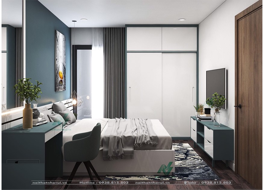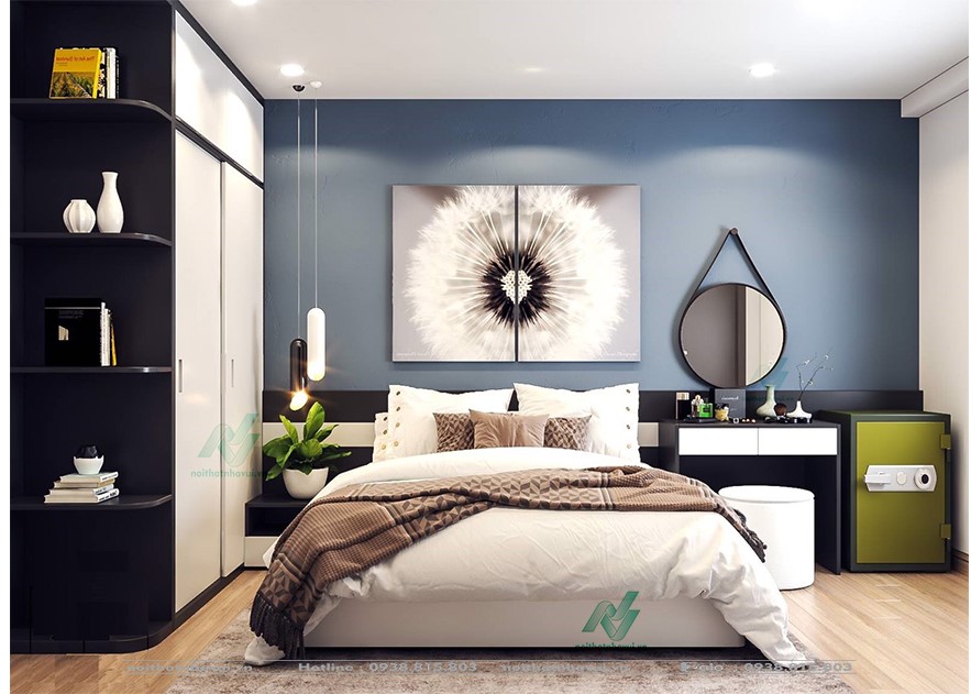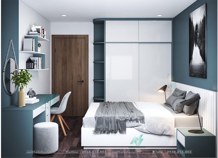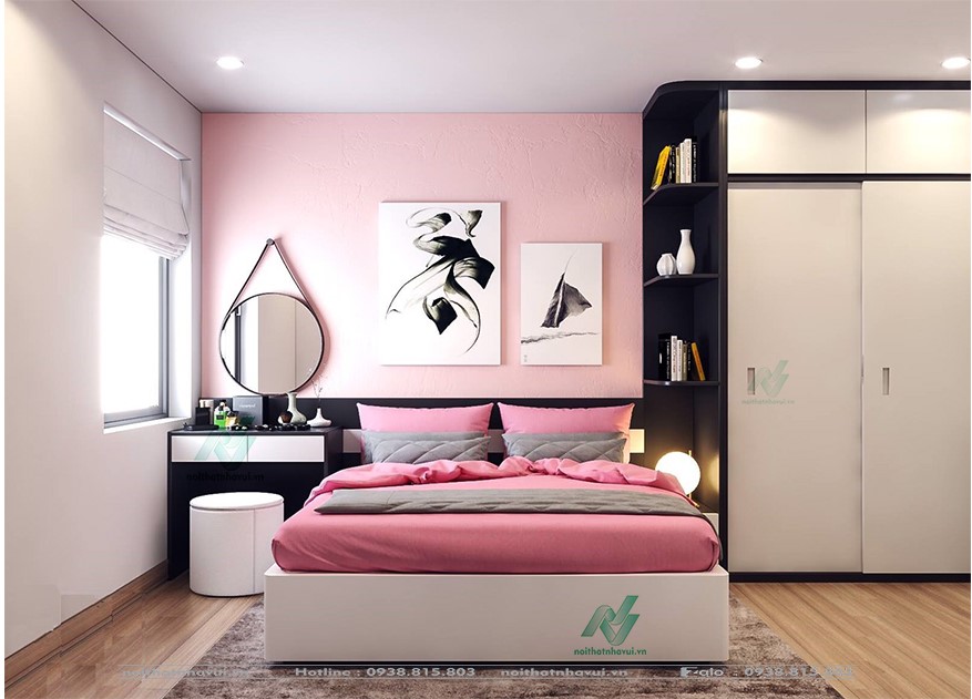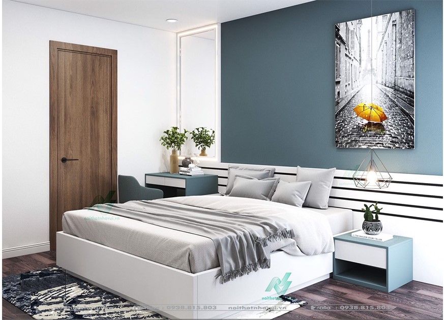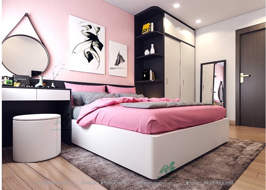 Giường tủ đầu giường và bàn trang điểm được thiết kế thành 1 khối