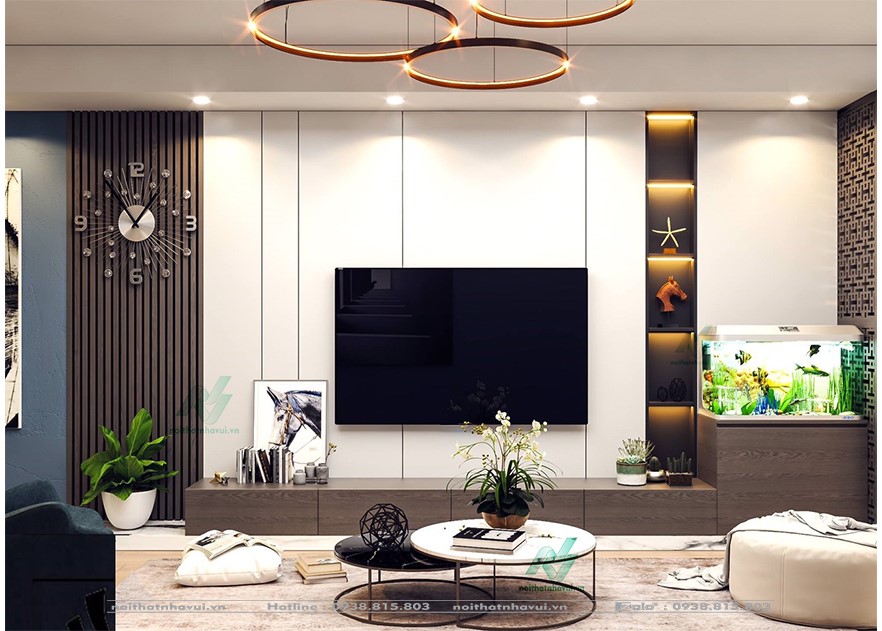 Vách kệ tivi được trang trí bởi vách ốp màu trắng nhẹ nhàng và nhấn bởi các thanh lam màu vân gỗ, kệ tivi được thiết kế khá đơn giản theo cách hiện đại