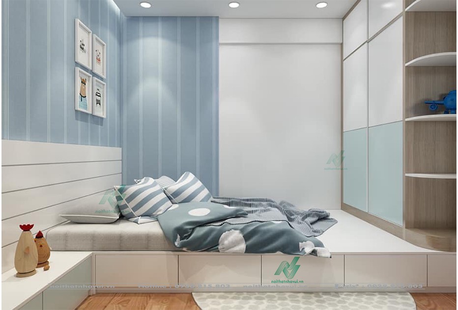 Phía dưới giường được tận dụng tối đa các hộc kéo và các kho