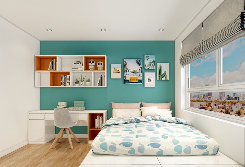 Bức tường phía đầu giường được trang trí điểm nhấn với màu xanh