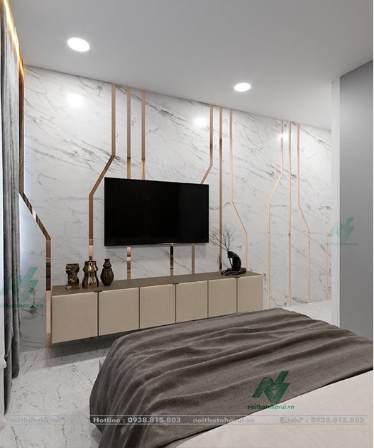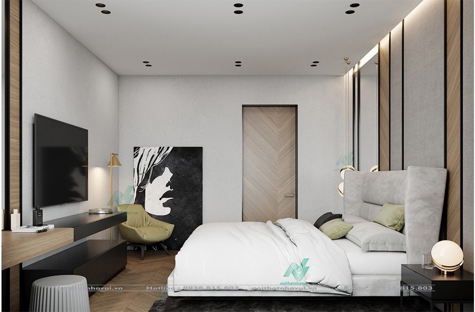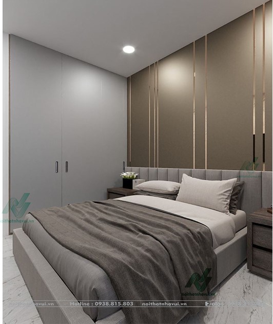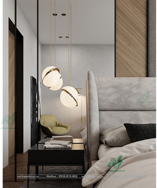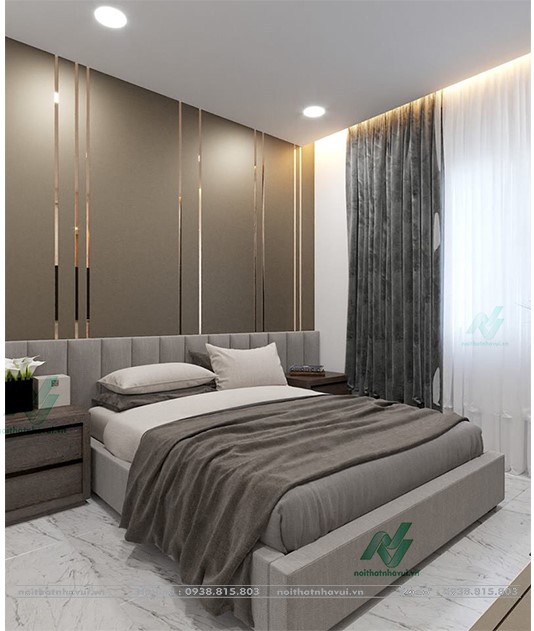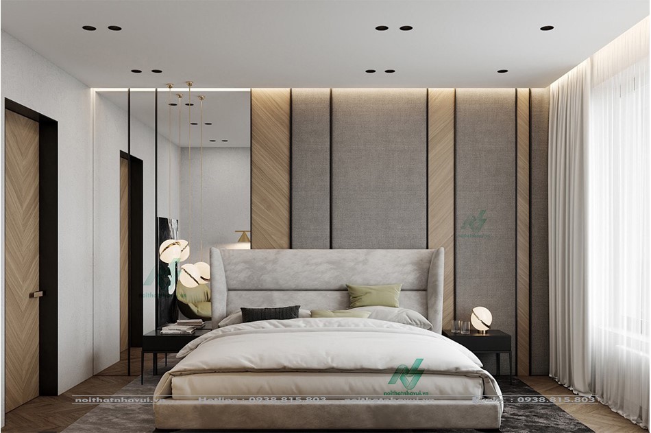 Vách đầu giường phòng ngủ Master được trang trí ốp vách làm điểm nhấn